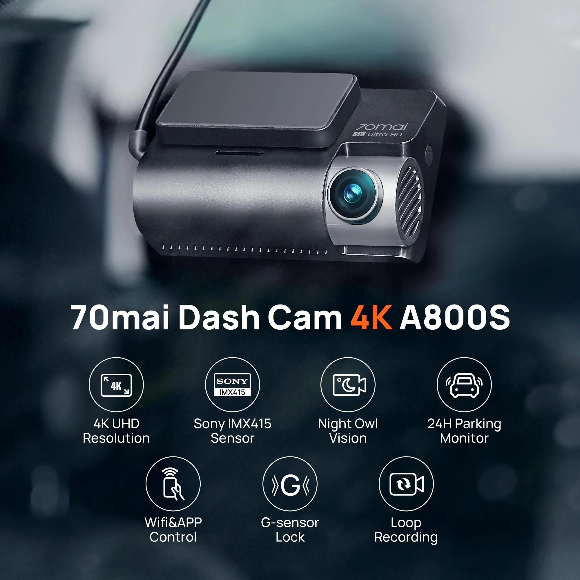 | Brand | 70mai | | Model Name | A800S-1 | | Vehicle Service Type | ATV, Bus, Car, Minivan, RV, Tractor, Truck, UTV, Uber | | Connectivity Technology | Wi-Fi | | Special Feature | App Control, 4K Dash Cam, Built-In GPS & WiFi, ADAS, Loop Recording, G-Sensor, Night Vision, STARVIS IMX415 Sensor, Smart Parking Monitor, Time-lapseApp Control, 4K Dash Cam, Built-In GPS & WiFi, ADAS, Loop Recording, G-Sensor, Night Vision, STARVIS IM… See more | | Video Capture Resolution | 2160P, 1080P | | Included Components | Car Charger x1, Mount x1, Dash Cam x1, Rear Cam x1, Power Cord x1, Rear Cam Power Cord x1, User Manual, Wiring Crowbar x1, Electrostatic Sticker x2Car Charger x1, Mount x1, Dash Cam x1, Rear Cam x1, Power Cord x1, Rear Cam Power Cord x1, User Manual,… See more | | Mounting Type | Windshield Mount | | Color | Black | | Field Of View | 140 Degrees |