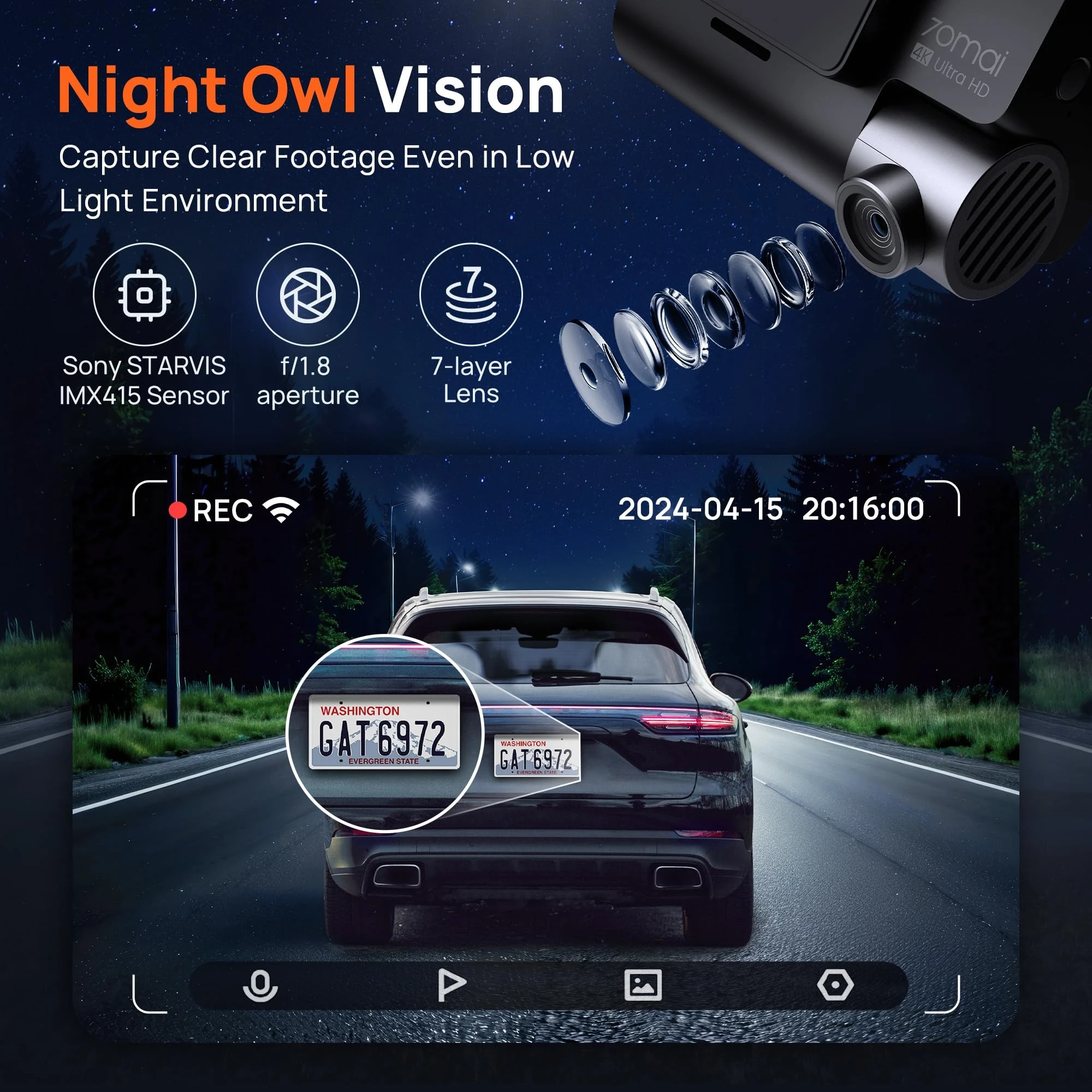 - 【Super Night Vision Function& 7-Glass/F1.8 Aperture Lens】The A800S car dash cam uses 7 layers of high quality glass lenses with F1.8 aperture and Sony IMX415 Sensor that process frames faster to deliver images with better clarity and vividness, the camera minimizes image noise. It detects sudden changes in brightness, and automatically adjusts brightness for clear recording.The dash cam that can be used with confidence at any time of the day or in certain weather conditions