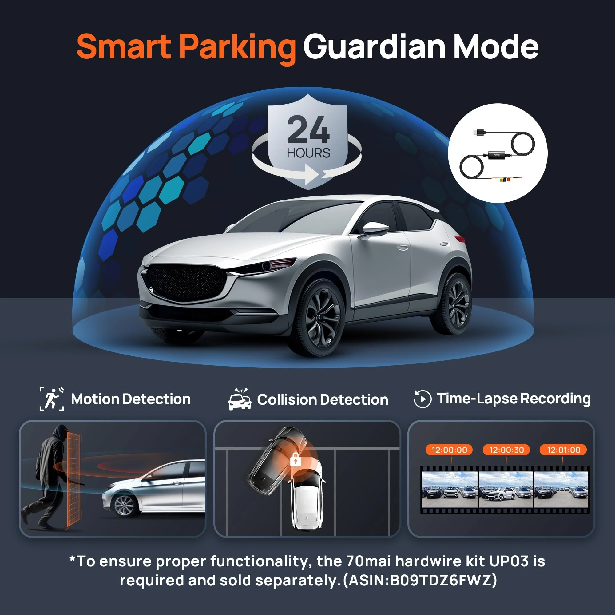 - 【24-Hour Parking Surveillance】Keep monitoring when you leave your car, the G-sensor automatically detects sudden shakes or collisions and starts recording, providing critical evidence for every important moment for 24h. In the event of an accident, you'll receive a notification to check the event footage in the 70mai app. 70mai Hardwire Kit UP03 (B09TDZ6FWZ, not included) is required for parking mode