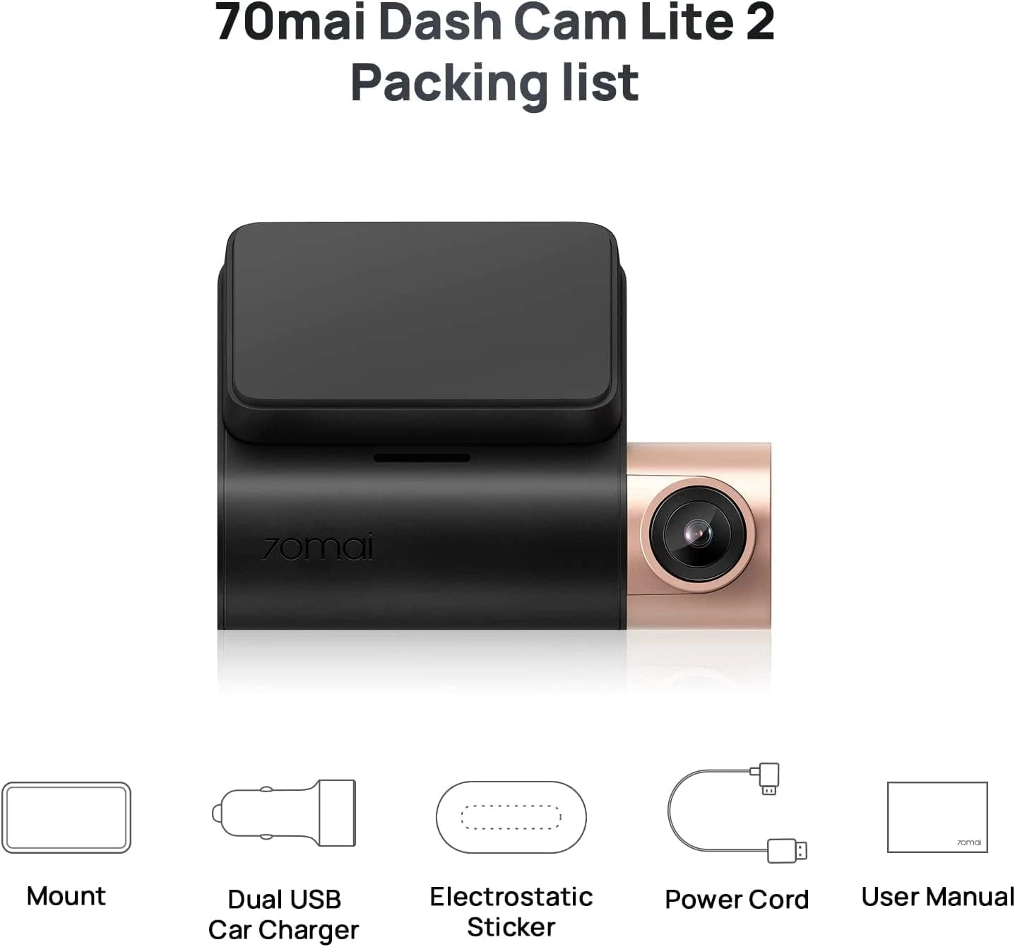 | Brand | 70mai | | Model name | Lite | | Vehicle service type | Car | | Connectivity technology | Wi-Fi | | Special feature | G-Sensor, Loop Recording, Night Vision, Voice Alert | | Video capture resolution | 1080p | | Included components | 70mai Dash Cam Lite2, Mount,Power Cord, USB Car Charger, Electrostatic Sticker, User Manual (Not included SD Card)70mai Dash Cam Lite2, Mount,Power Cord, USB Car Charger, Electrostatic Sticker, User Manual (Not included SD Card) | | Mounting type | Suction Mount | | Colour | Lite | | Field of view | 130 Degrees | | Brand | 70mai | | Manufacturer | 70mai | | Place of Business | Room 2220,Building 2,No.588 Zixing Road Shanghai Minhang District 200000 CN | | Model Name | Lite | | Compatible Devices | car, truck, motorcycle | | Special features | G-Sensor, Loop Recording, Night Vision, Voice Alert | | Mounting Hardware | 70mai Dash Cam Lite2, Mount,Power Cord, USB Car Charger, Electrostatic Sticker, User Manual (Not included SD Card) | | Number of Items | 1 | | Standing screen display size | 2 | | Display type | LCD | | Video capture resolution | 1080p | | Batteries included | Yes | | Batteries Required | Yes | | Battery Cell Composition | Lithium Ion | | Connector Type | Wi-Fi | | Compatible media type | JPG, MOV | | Mounting type | Suction Mount | | Actual viewing angle | 130 Degrees | | Does it contain liquid? | No | | Includes rechargable battery | Yes | | Manufacturer | 70mai | | Product Dimensions | 8.3 x 3.79 x 6.05 cm; 99 g | | ASIN | B0B3XCHMS7 |