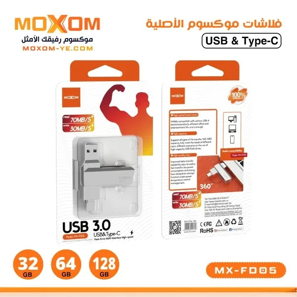 Dual USB + Type-C ports. Available capacities: 32GB – 64GB – 128GB. High quality with a two-year warranty. Features very high data transfer speed. Read speed: 70MB/s. Write speed: 30MB/s. Latest USB 3.0 version. |