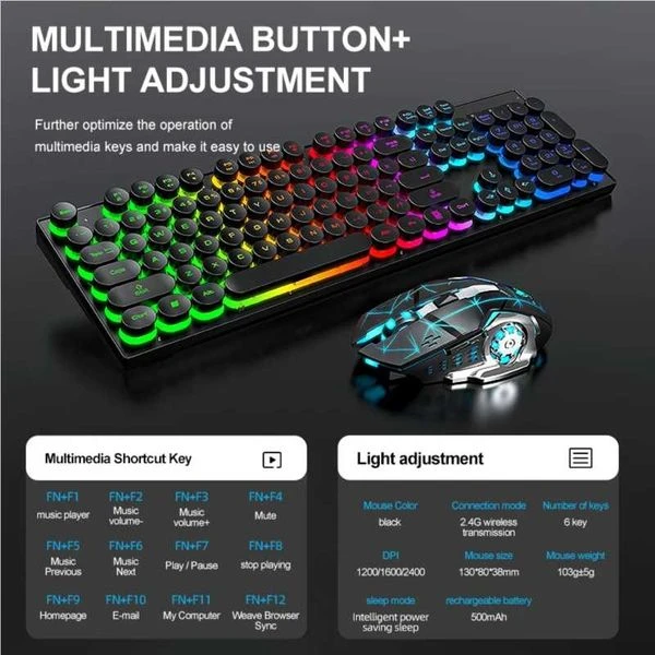 Type: Luminous wireless keyboard and mouse set Interface: USB Connection: Wireless Lighting: Color backlight Material: ABS Net weight: keyboard and mouse Color: Black Waterproof: splash proof Mouse size 137 * 82 * 46mm Keyboard size 437 * 128 * 30mm |